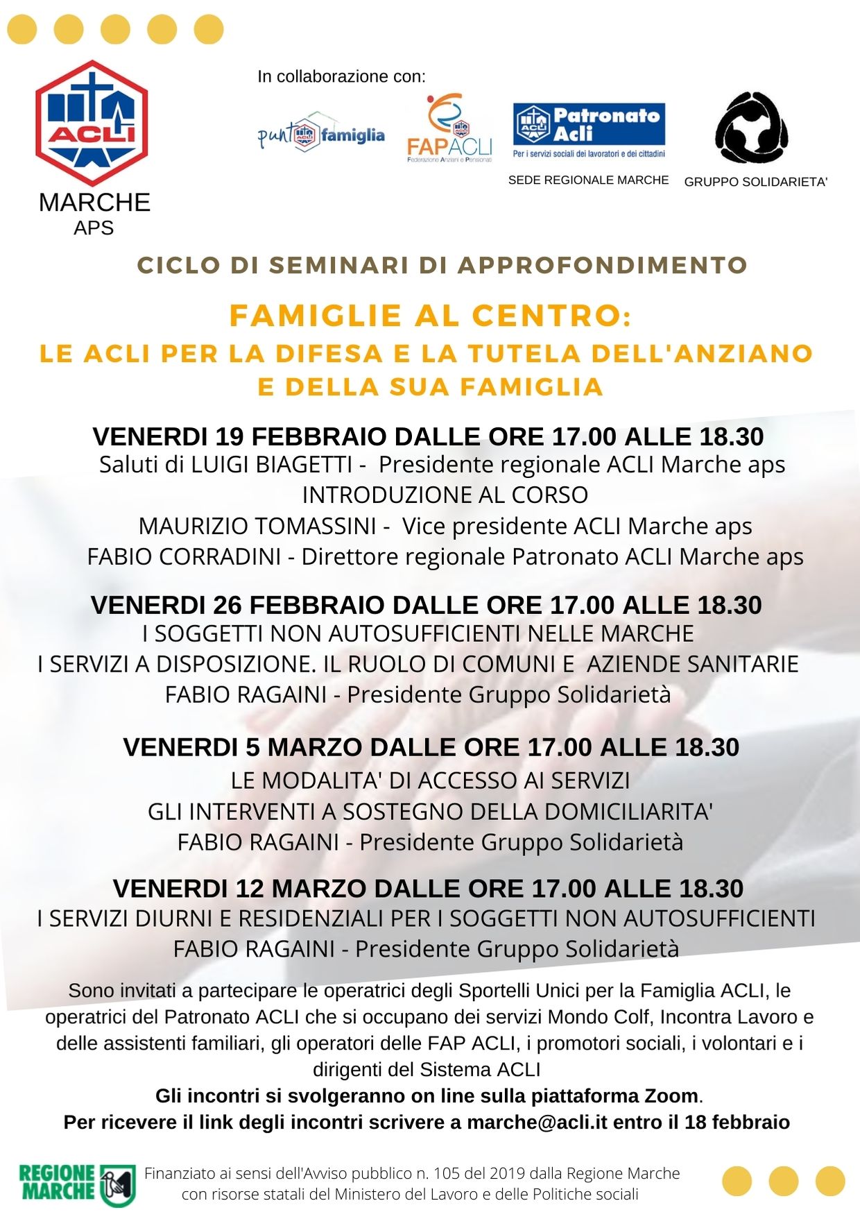 Dopo i saluti del Presidente regionale delle ACLI Marche Luigi Biagetti, interverranno in questo primo appuntamento il Vicepresidente regionale delle ACLI Maurizio Tomassini e il Direttore regionale del Patronato ACLI Fabio Corradini.