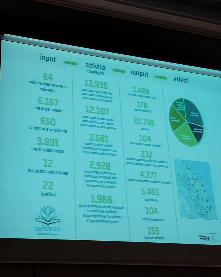 Si è svolto il 15 febbraio al Ridotto delle Muse di Ancona l’evento conclusivo del Progetto “Welfare Cult relazioni cultura e benessere” con la presentazione dei risultati dell’attività stessa. Solo qualche numero per comprendere quanto il progetto sia stato partecipato dai cittadini marchigiani e dagli operatori: 34539 le persone raggiunte e partecipanti alle attività, 155 comuni coinvolti con 104 tipologie di attività realizzate dai 650 volontari che si sono spesi per il progetto che aveva lo scopo di facilitare l’accesso alla cultura per condividere ed includere; cultura come strumento di welfare generativo per le comunità di riferimento. Luigi Biagetti, presidente di Acli Marche associazione capofila del progetto stesso, non ha nascosto, nel suo intervento, la soddisfazione per il lavoro svolto, sottolineando la capacità dei 12 partner e 22 fornitori dei servizi di fare rete attivando una governance multilivello e la capacità delle associazioni di animare con le diverse attività anche territori svantaggiati. Dal teatro sociale, alle passeggiate naturalistiche nelle dimore storiche, alla promozione della cultura digitale negli anziani, all’educazione al consumo sostenibile. E ancora laboratori intergenerazionali, rassegne teatrali, cineforum, eventi musicali, presentazione di libri. I risultati presentati nel dettaglio da Giuseppina De Angelis, valutatrice del progetto con il commento di Stefania Battistoni responsabile dello stesso, hanno reso perfettamente l’dea di come sia stato raggiunto l’obiettivo di Welfare Cult: facilitare l’accesso stesso alla cultura, considerando tutti gli ostacoli di ordine sociale, economico, personale, comprese quelle dell’apprendimento. Soddisfazione è stata espressa anche dalla dirigente della regione Immacolata De Simone presente all’iniziativa. Ancora i numeri a testimoniare l’impegno profuso: 178 disabili, 22.798 anziani, 104 immigrati e nomadi, 232 persone partecipanti in situazione di povertà, disagio adulti e senza dimora, 4.277 giovani, adolescenti e studenti coinvolti nelle tante iniziative. Con questo progetto ha sottolineato l’assessore Chiara Biondi il mondo del sociale e della cultura hanno trovato un punto di incontro nel Welfare culturale, la cultura che “include” diventando strumento per promuovere il benessere e superare individualismo e precarizzazione. Anche il presidente della Regione ha voluto ringraziare e salutare i presenti sottolineando come le piccole e grandi le associazioni rappresentino un indispensabile patrimonio per tutta la comunità.