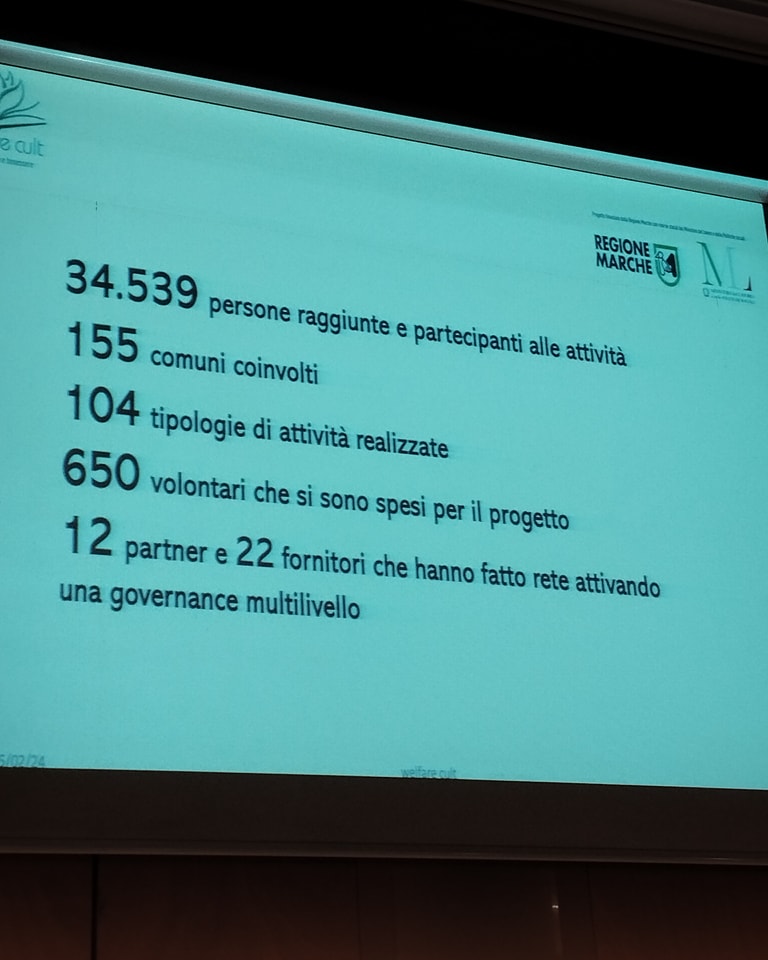 Presentati ad Ancona i risultati di “Welfare Cult: relazioni, cultura e benessere” il progetto finanziato dalla Regione Marche con le risorse del Ministero del lavoro e delle Politiche sociali, con capofila le ACLI Marche che ha visto 12 partner e 22 associazioni impegnate in rete su tutto il territorio regionale. Molto partecipato l’evento. Presente anche il presidente della Regione Marche Acquaroli